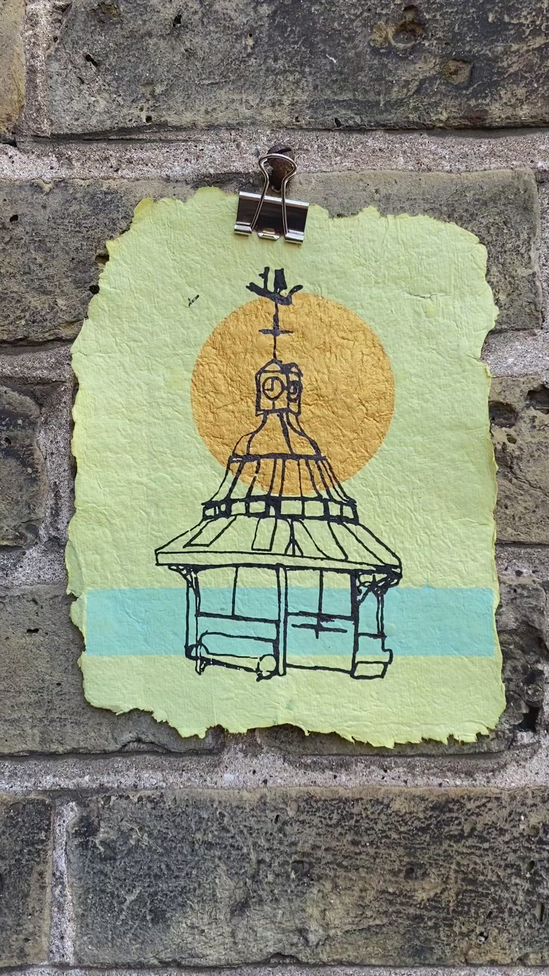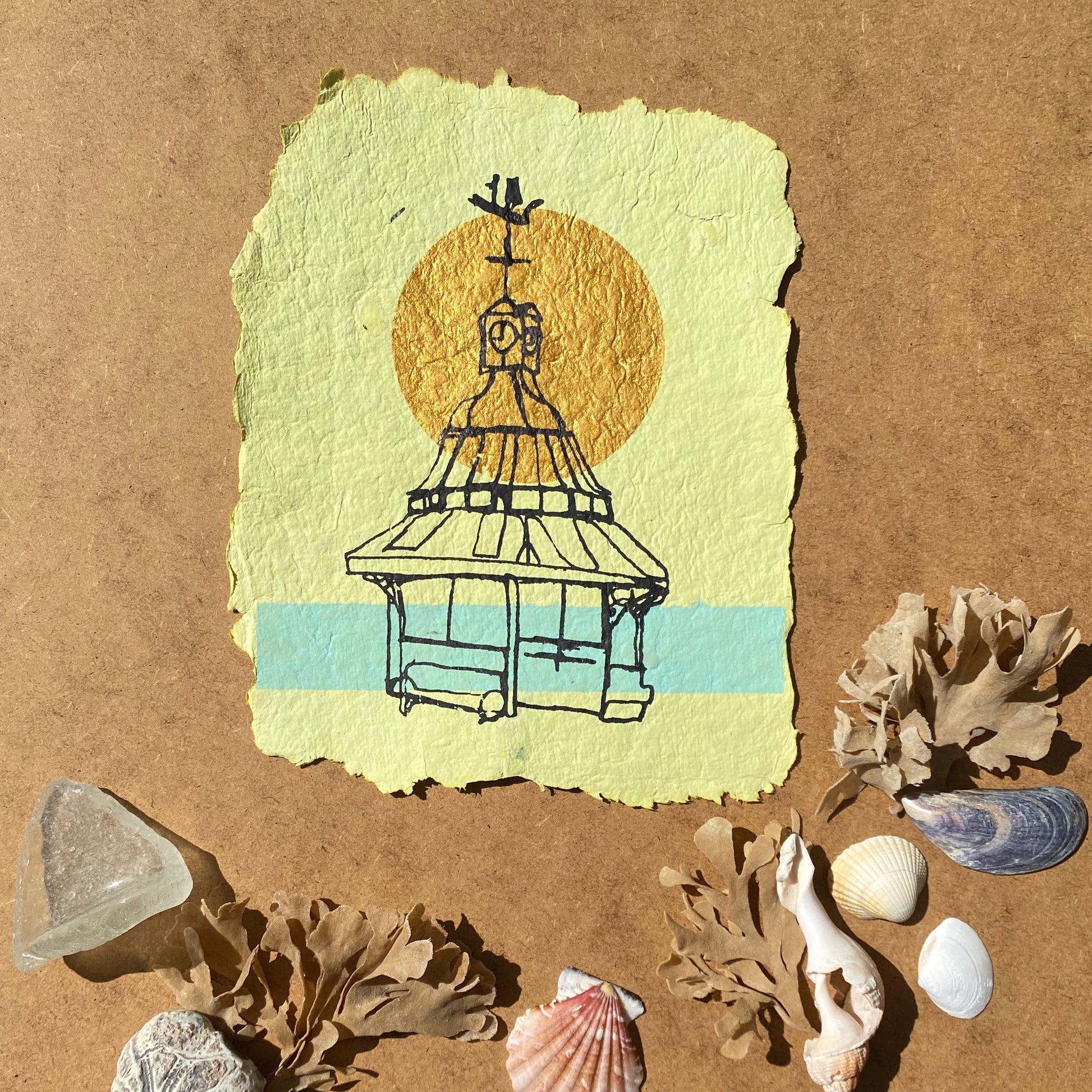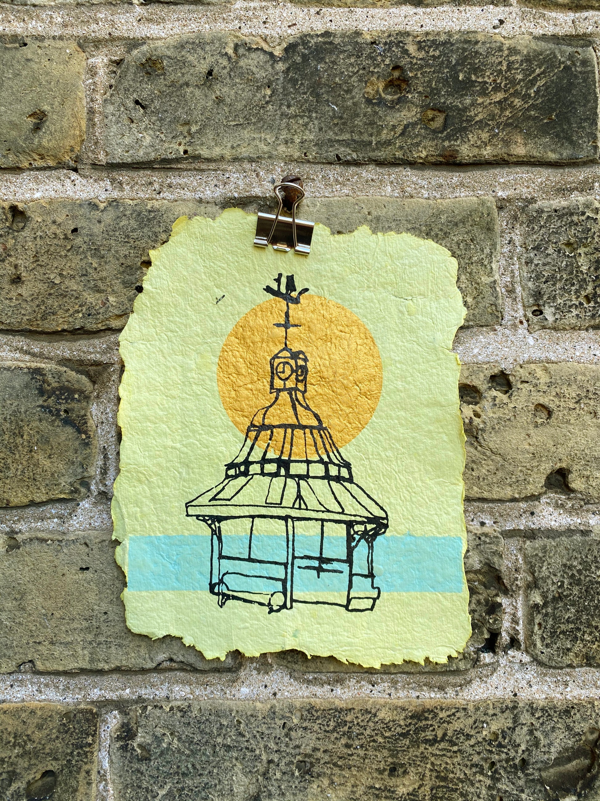 This abstract three colour print of clifftop Clocktower shrouded by the golden sun overlooking Broadstairs Beach is printed onto 100% recycled handmade paper. Each print is beautifully unique due to the nature of the handmade paper.