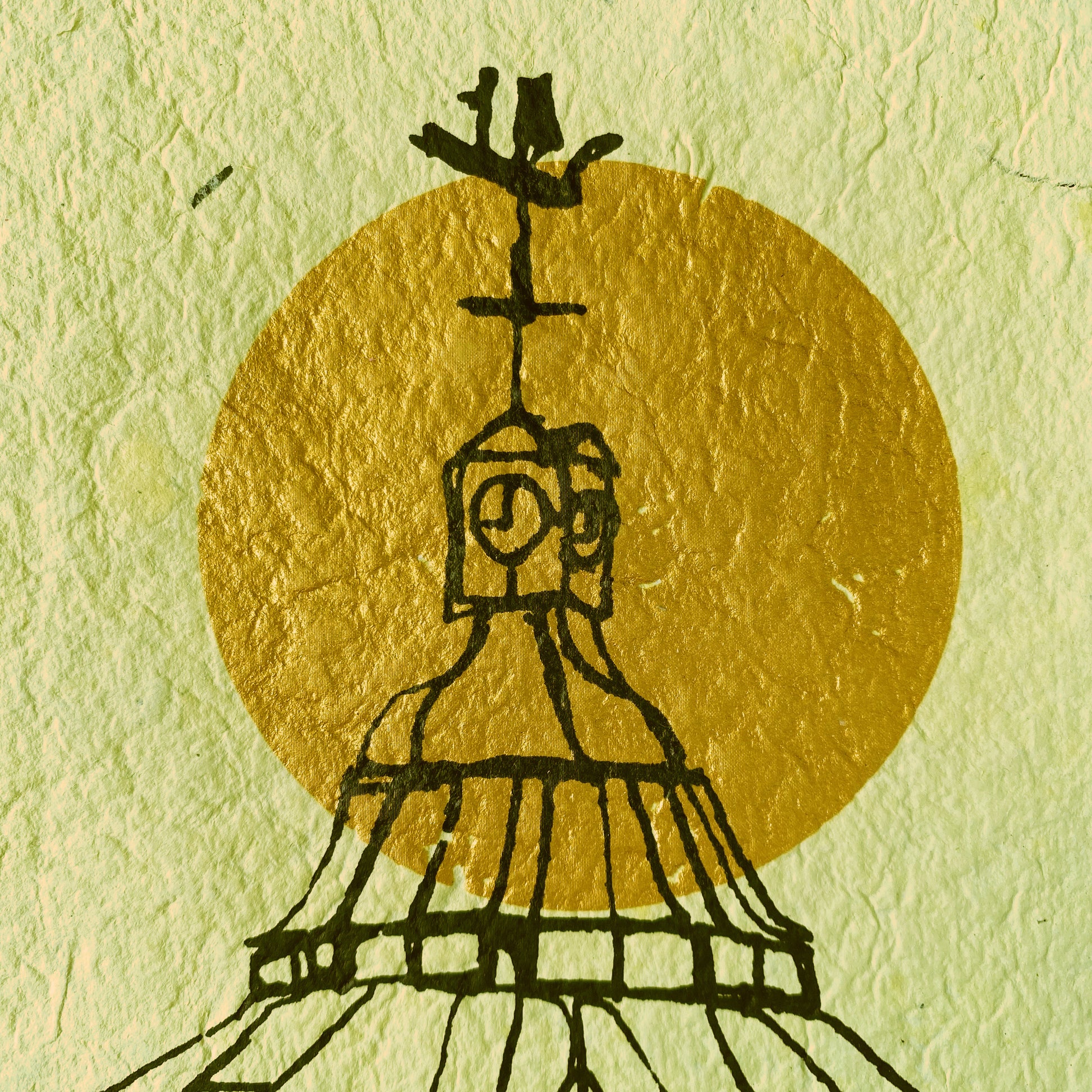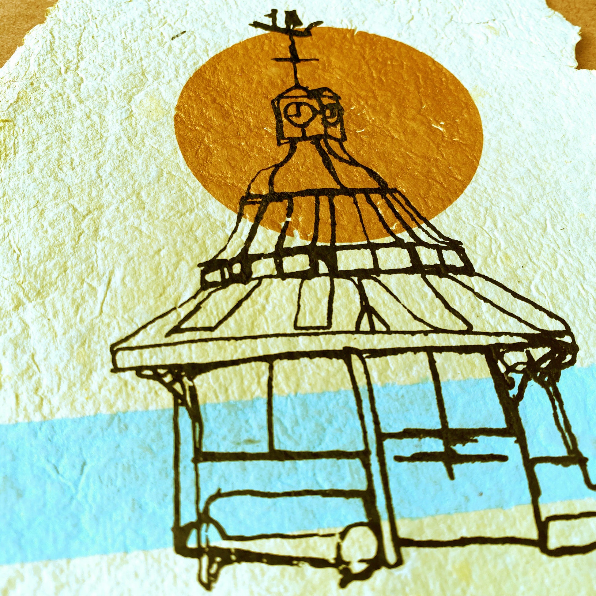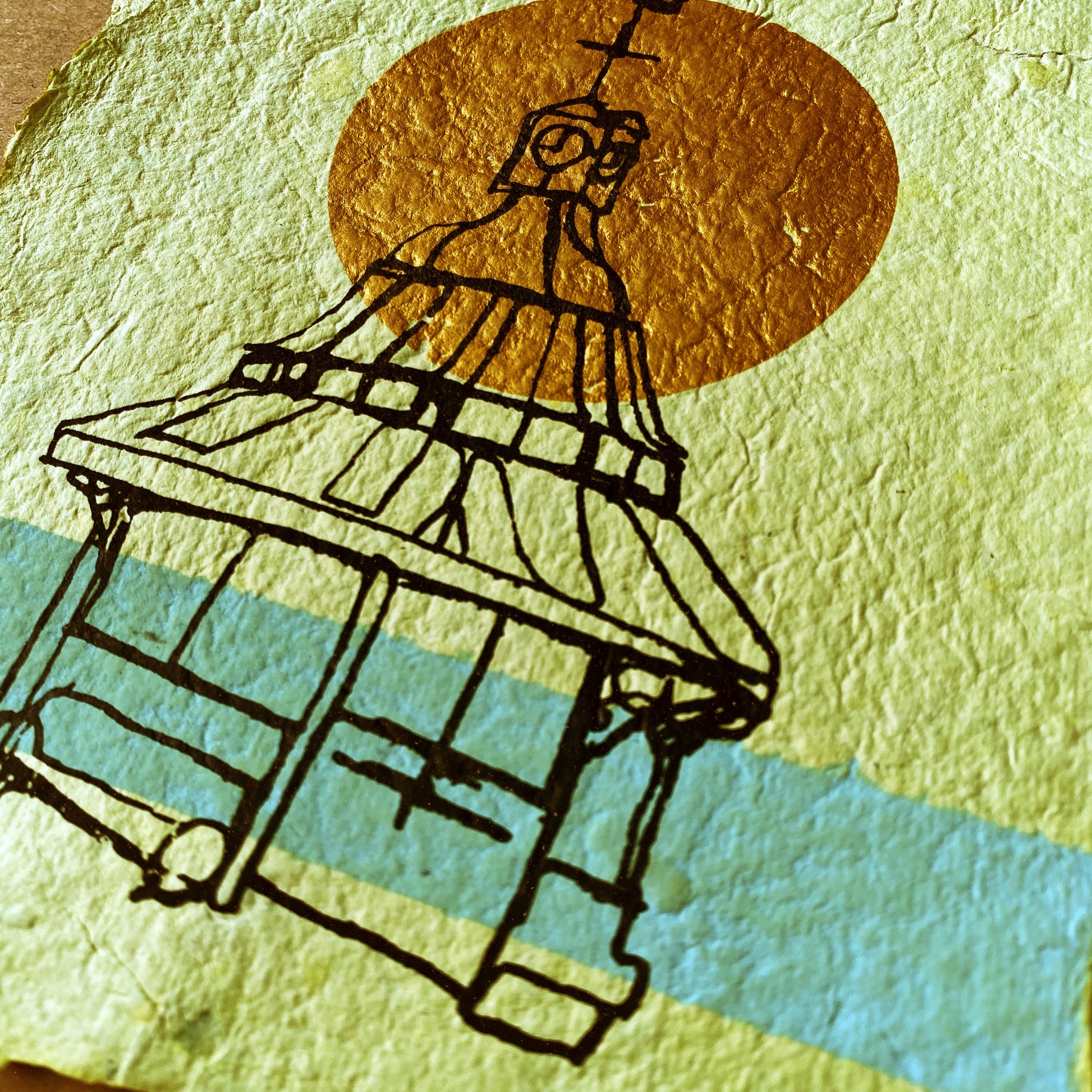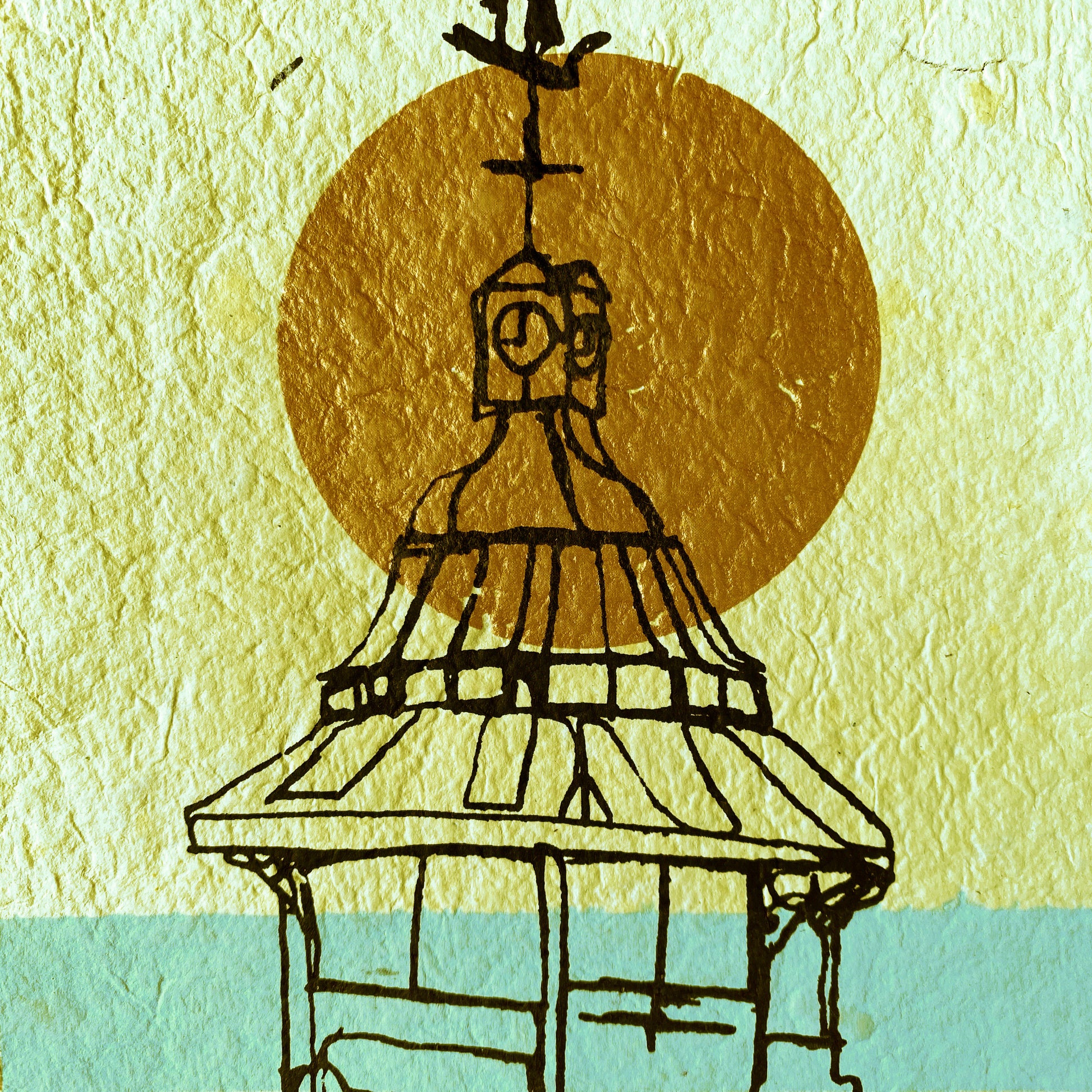 This abstract three colour print of clifftop Clocktower shrouded by the golden sun overlooking Broadstairs Beach is printed onto 100% recycled handmade paper. Each print is beautifully unique due to the nature of the handmade paper.