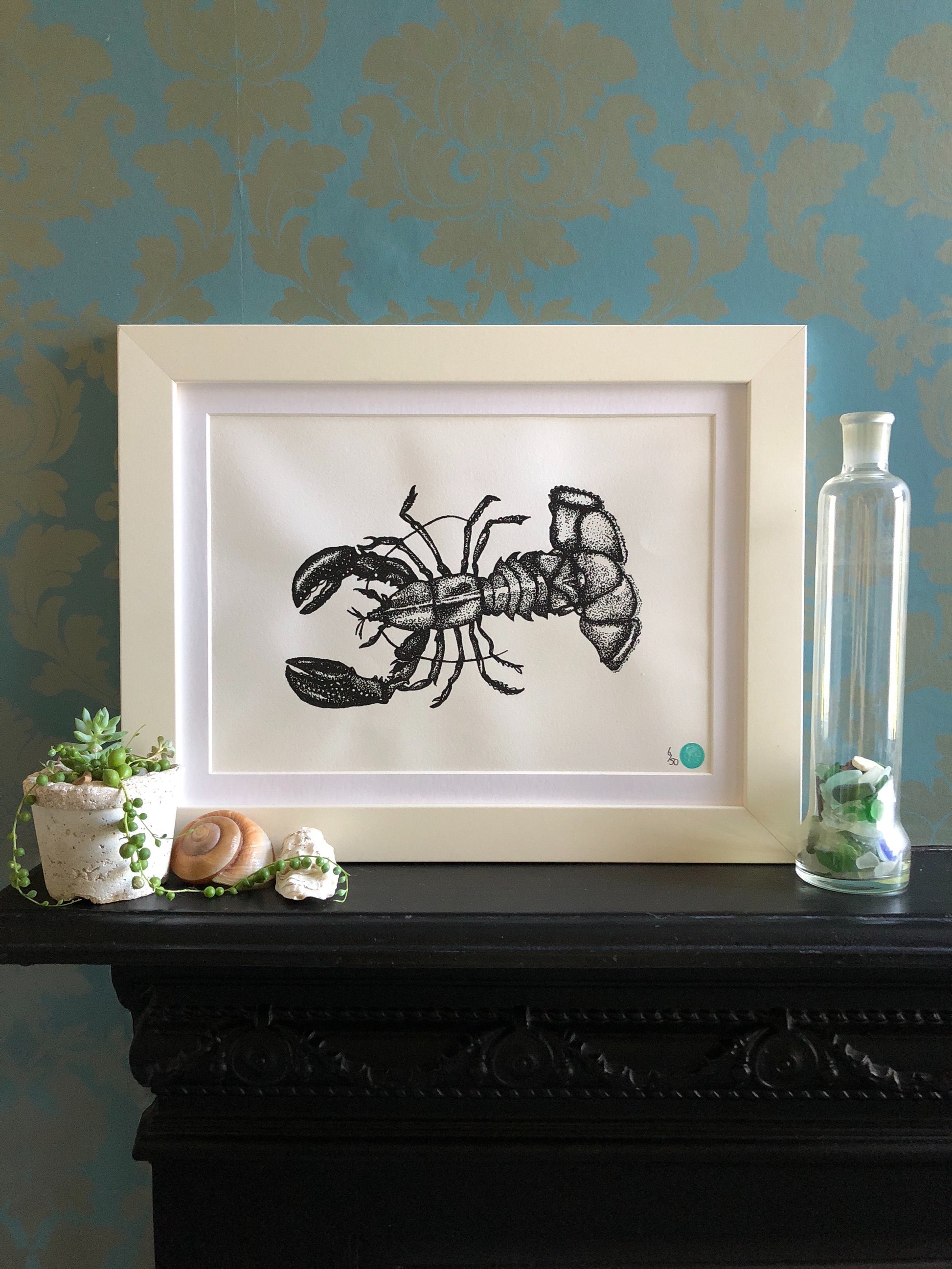 Beautiful handprinted limited edition print of Larissa the Lobster, taken from the original illustration by Gem Blastock.