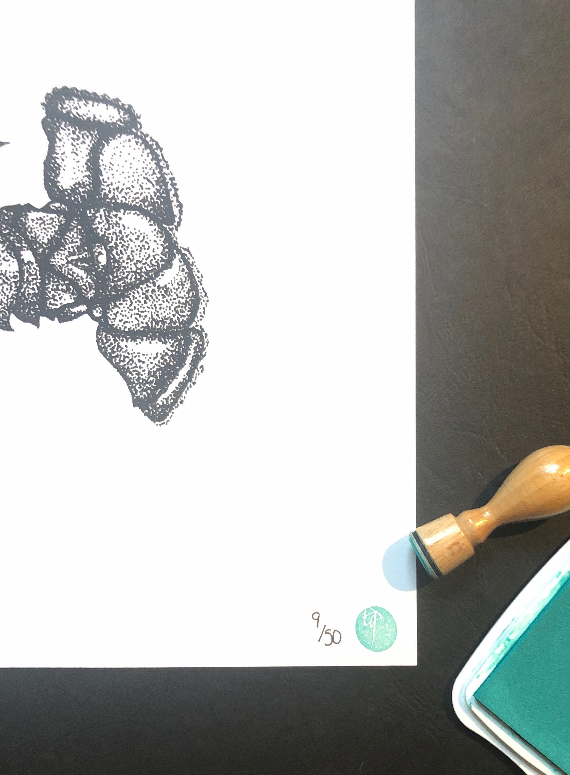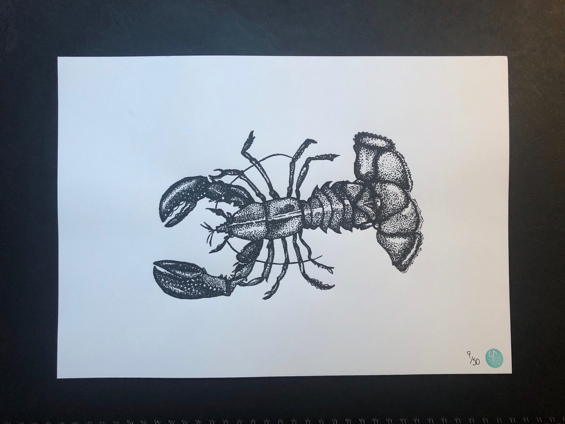 Beautiful handprinted limited edition print of Larissa the Lobster, taken from the original illustration by Gem Blastock.