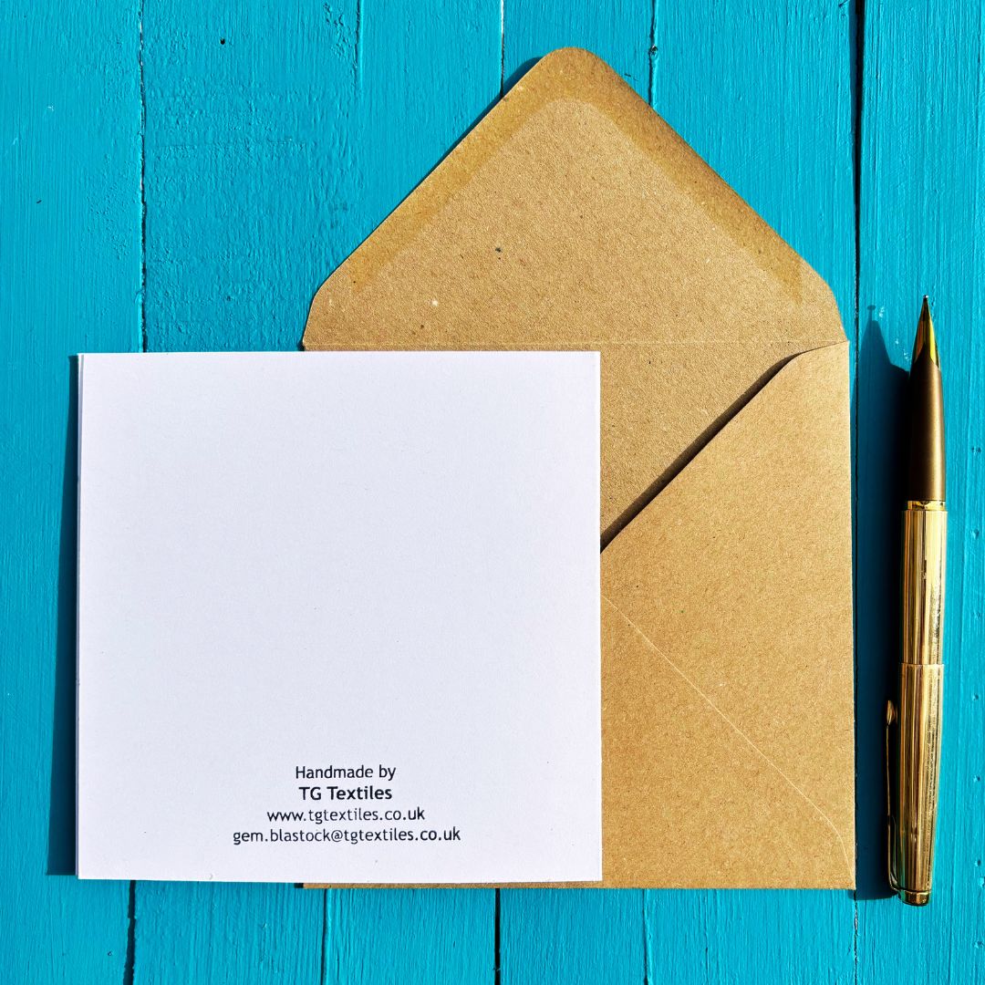 The card is screen printed with waterbased inks, which are biodegradable and recyclable, making it a sustainable and eco-friendly choice. Each card is unique due to its hand-screen-printed nature and the recycled materials used.
