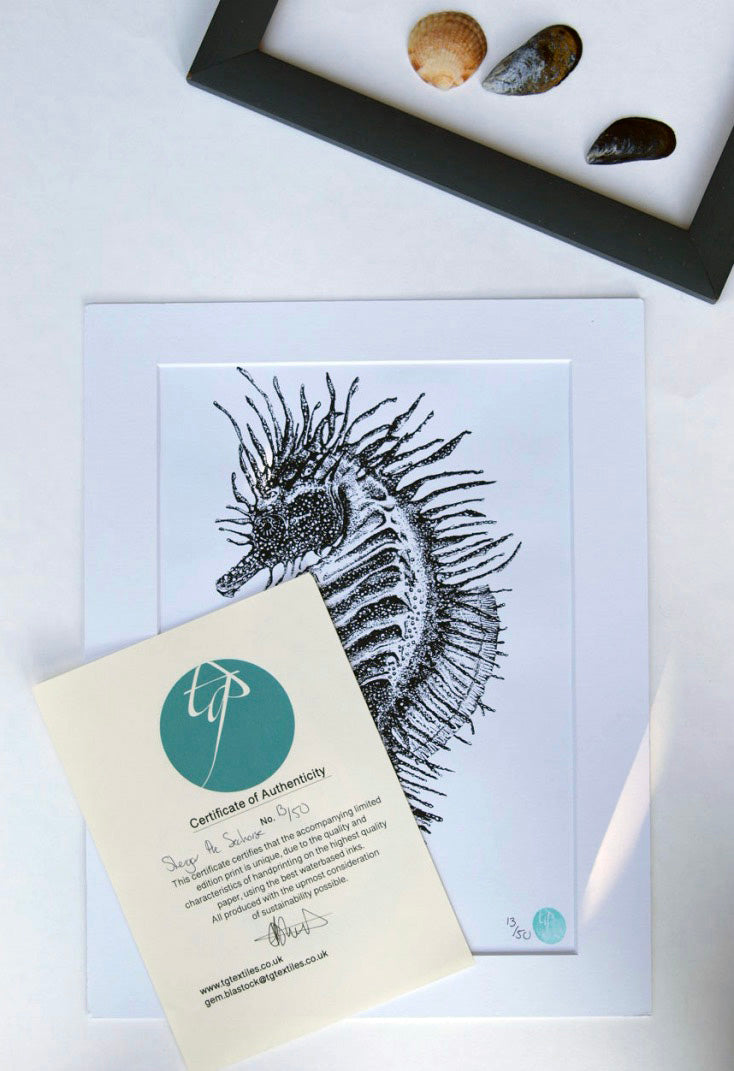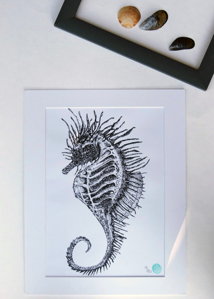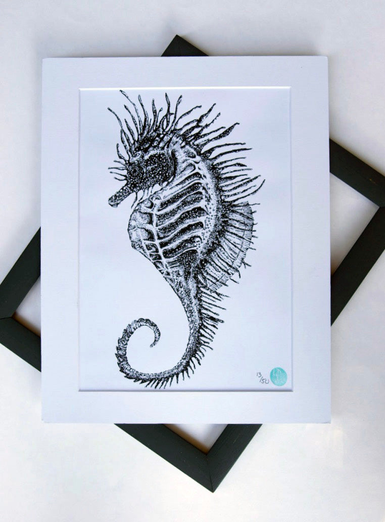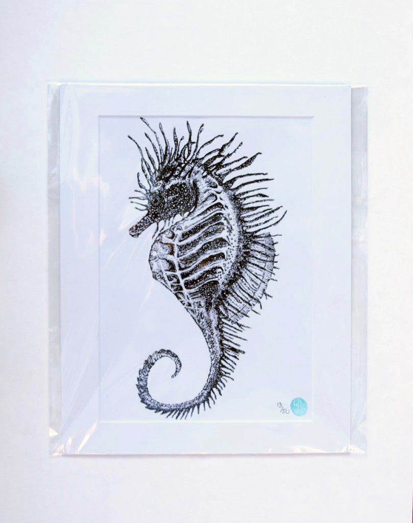 The spiny seahorse is native to the coastline of the UK, one of only two species. These wonderful animals grow to about 15-17cm in length and are currently under threat. So I am proud to announce that 10% of the profit from these prints will be donated to Guardians of the Deep, a Kent based charity who help to educate and protect our shorelines along the Kent Coast, my home.