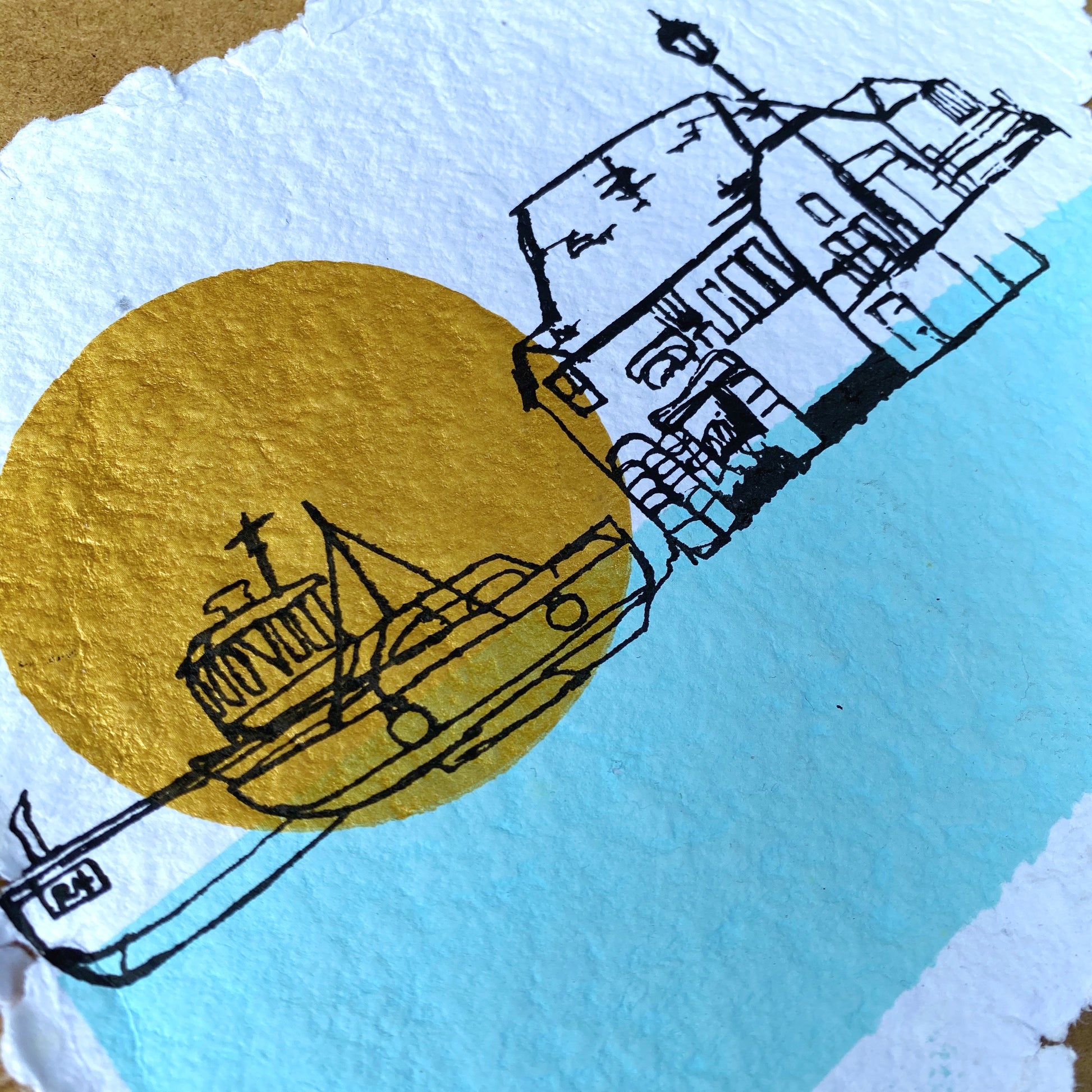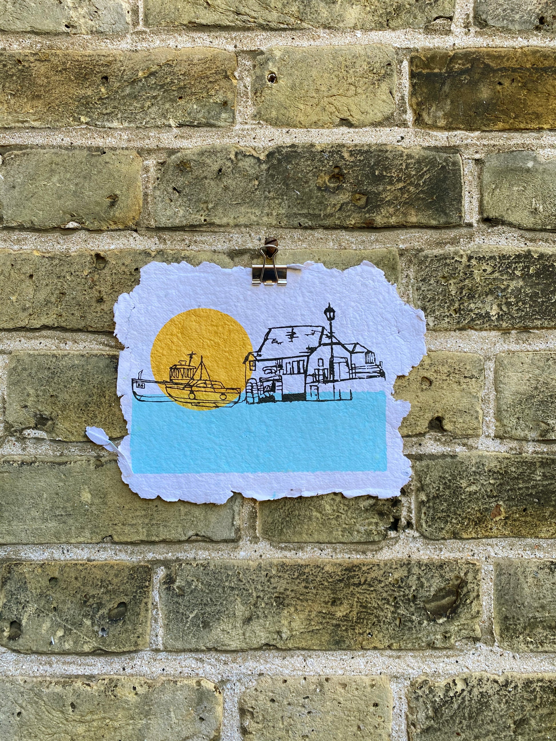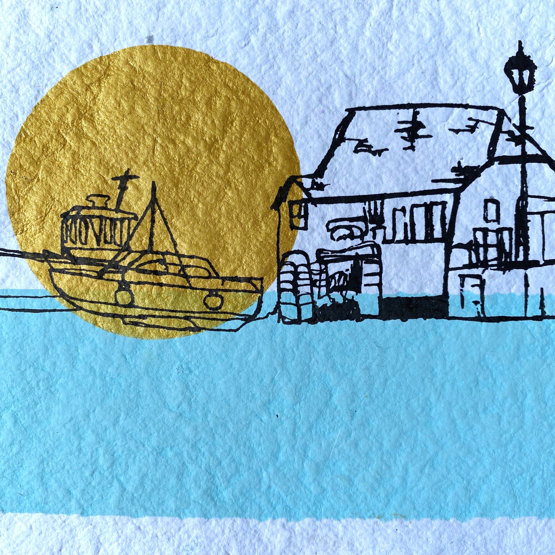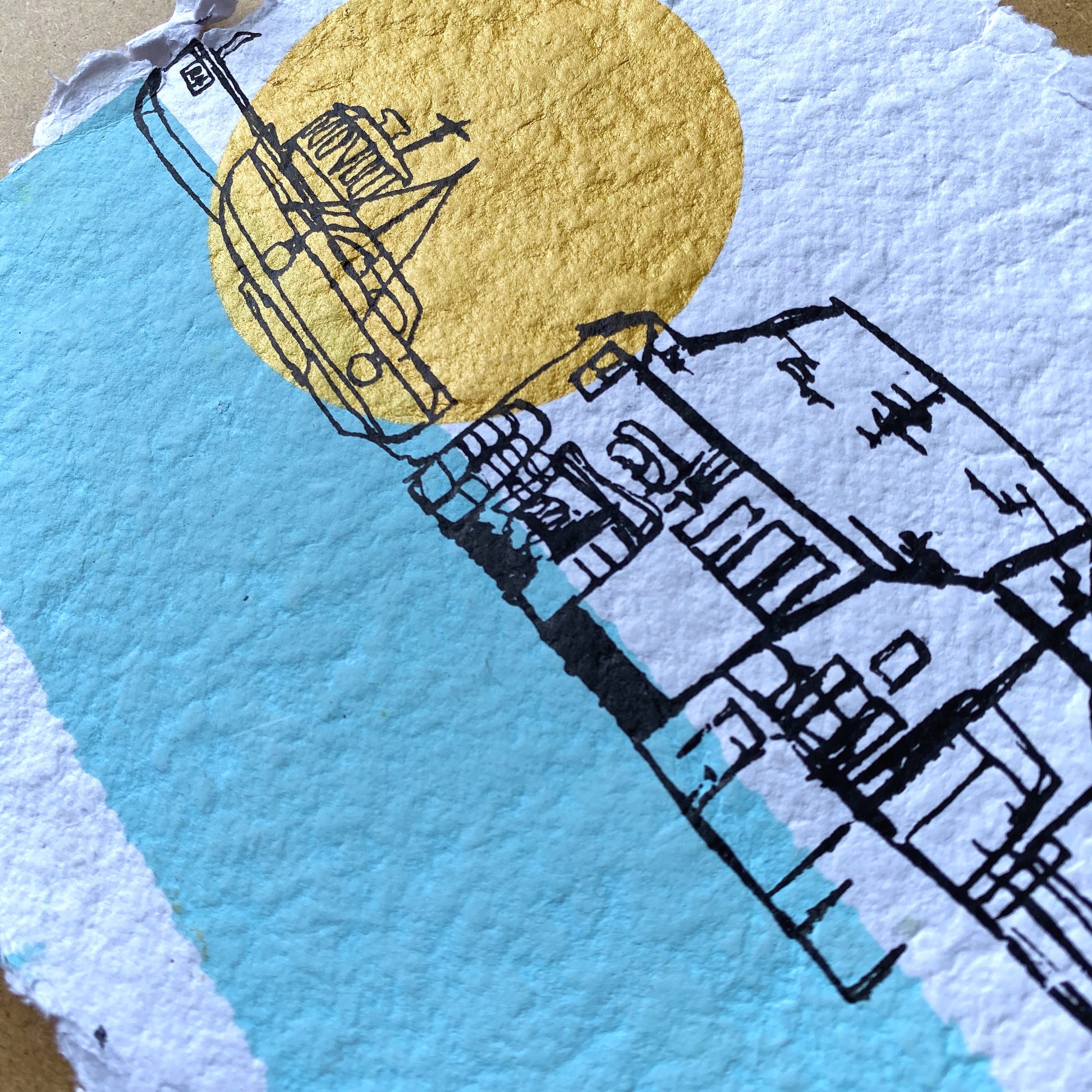 This abstract three colour print of the Old Look Out house surrounded by the blue sea as the sun rises over Broadstairs Beach is printed onto 100% recycled handmade paper. Each print is beautifully unique due to the nature of the handmade paper.