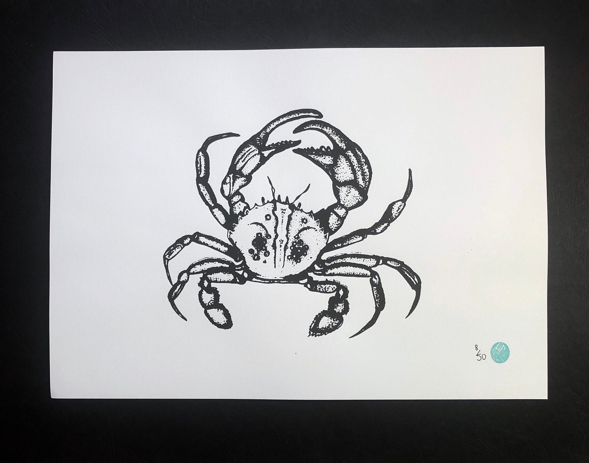 Beautiful handprinted limited edition Crab print, taken from the original illustration by Gem Blastock.